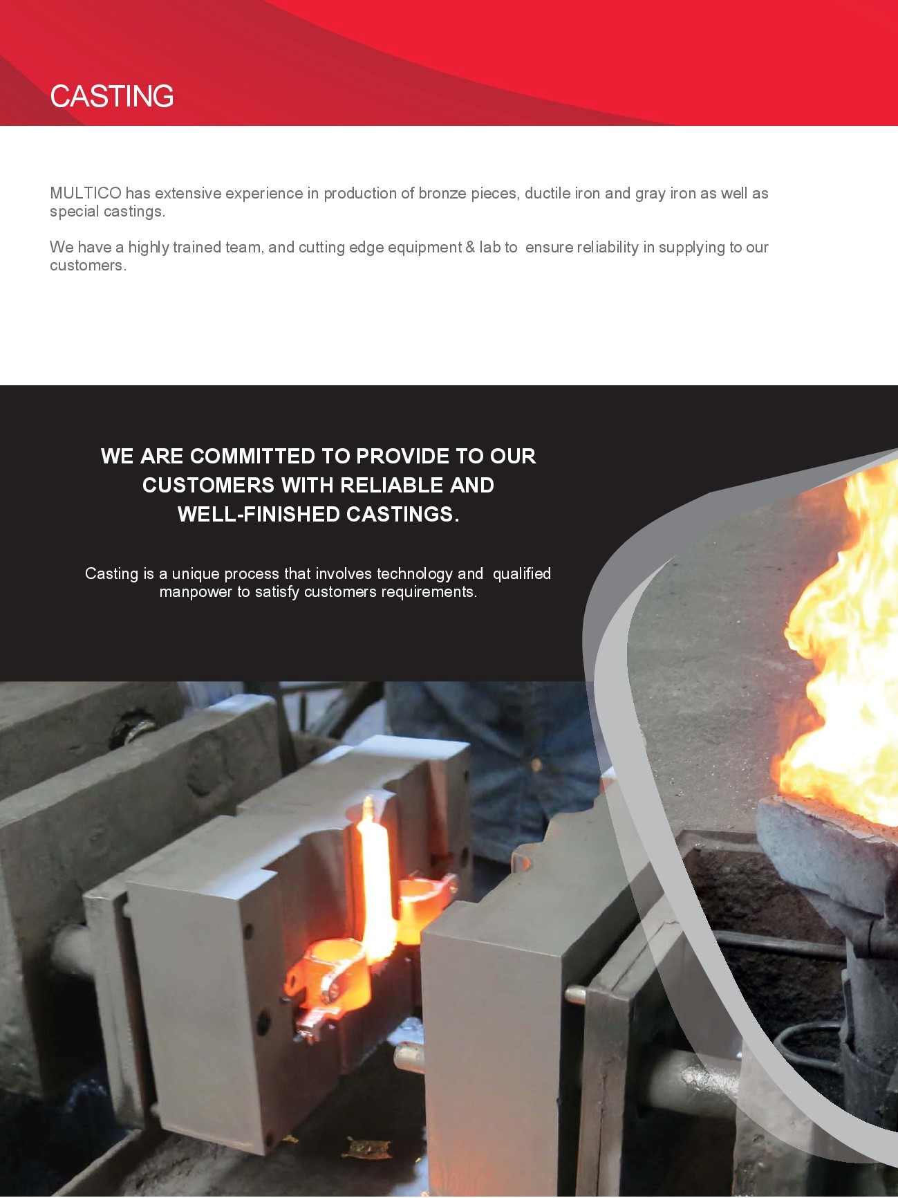 MULTICO has the capacity and experience to manufacture cast bronze alloy products up to 75 kilograms per piece, gray iron and nodular iron up to 180 kilograms per piece, which is why it offers these high quality casting products at very low prices.